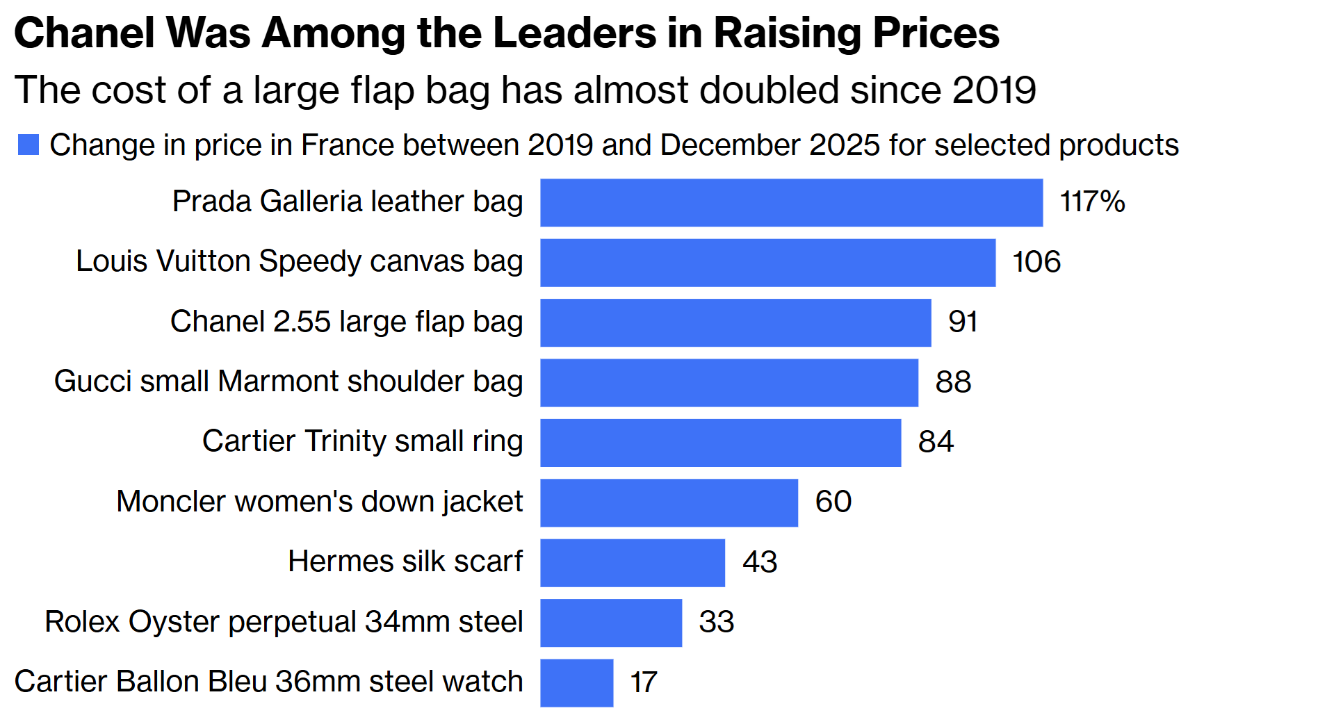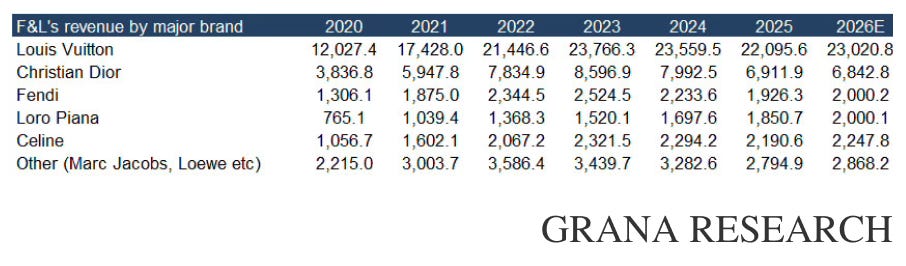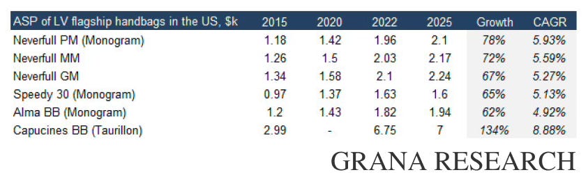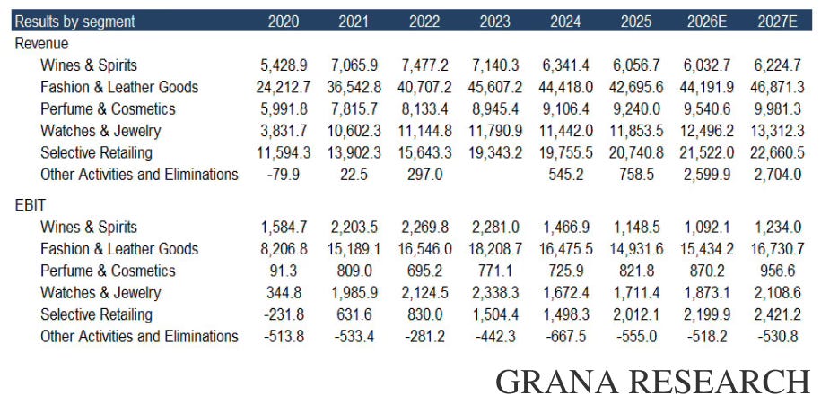 The Louis Vuitton brand has historically enjoyed strong pricing power: a 5% increase in prices for key products — primarily iconic handbags — would theoretically add around 2% to segment revenue. This implies that handbags account for roughly 40% of Fashion & Leather Goods (F&LG) revenue. And the company has actively leveraged this.